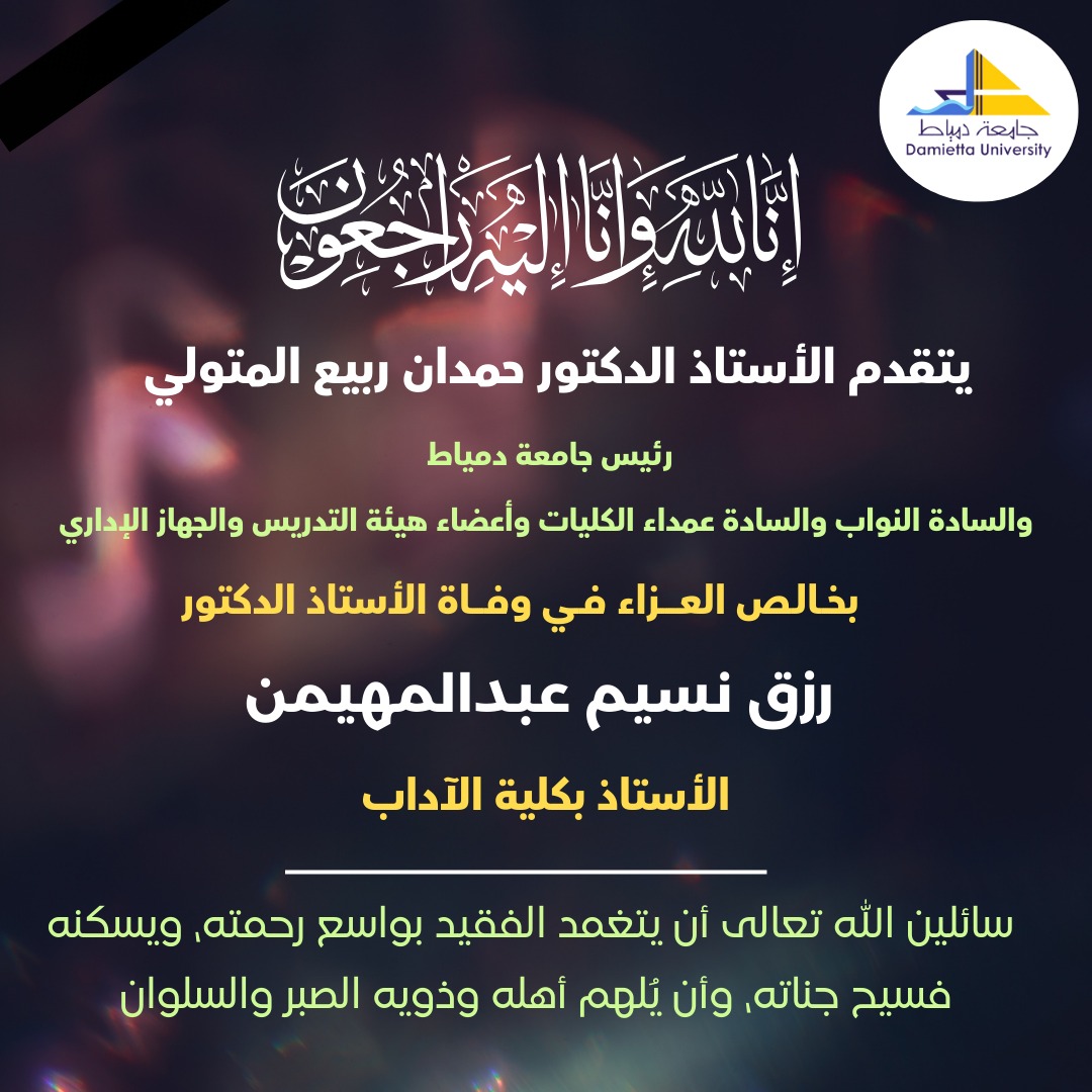 ببالغ الحزن والأسى، تنعى جامعة دمياط برئاسة الأستاذ الدكتور حمدان ربيع المتولي، رئيس الجامعة، والسادة نواب رئيس الجامعة، وعمداء الكليات، وأعضاء هيئة التدريس، والجهاز الإداري، فقيد الجامعة الأستاذ الدكتور رزق نسيم عبدالمهيمن، الأستاذ بكلية الآداب،